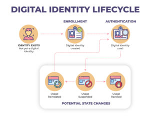 The example above describes the creation of a type of digital identity, the credential that associates you to your bank account. Let’s zoom out a bit and understand digital identities more broadly. At a high level, the lifecycle of a digital identity consists of three phases: