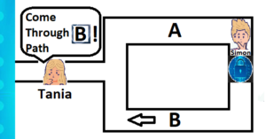 Simon secretly enters the cave through one of the paths, A or B. Then, Tania gets closer to the cave and asks Simon to come out through one path or the other. If Simon knows the secret code, he can open the gate and return through the path requested by Tania. The first time, Simon might have passed the test by chance, since there’s a 50% possibility that he entered through the same path Tania requested he exit. If the process is repeated multiple times, then the possibility that Simon exits through the same path chosen by Tania without having the secret code reduces considerably.